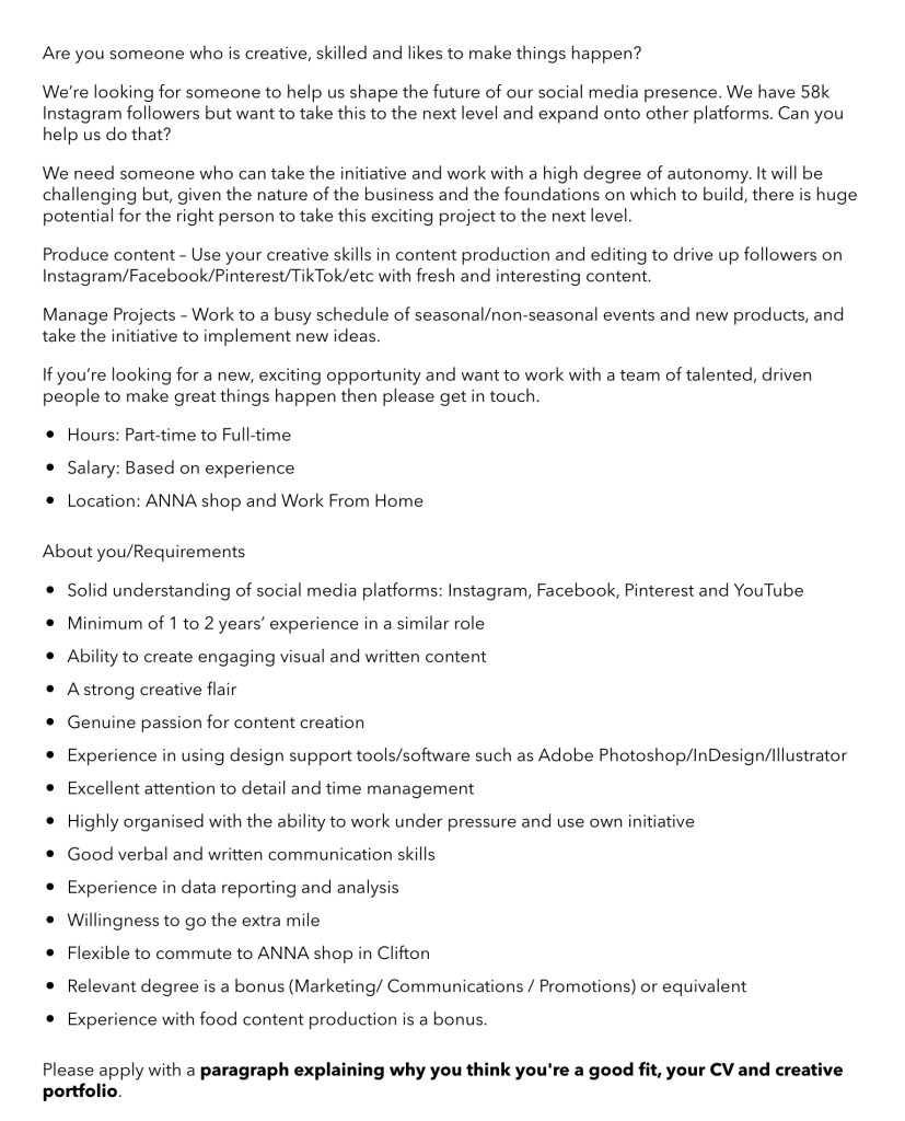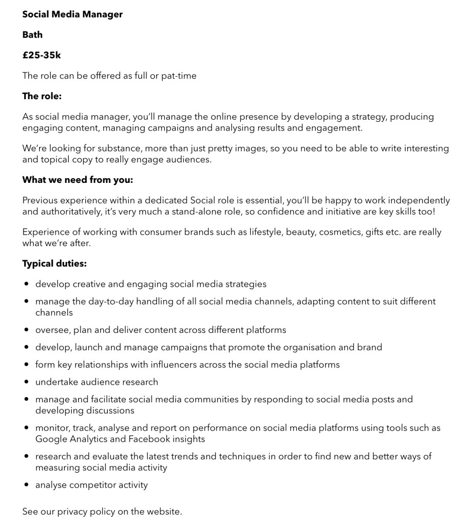 The first advert is more what I’d expect to see pre-covid. But managers are rarely implementing the social media themselves. Managers manage people and this job requires the applicant to undertake all the work themselves. The manager aspect simply comes from heading up all the responsibility of the work needing to be done. Its ridiculous to assume that the role can be offered part time, when the implementation of the social media work alone is a full time role in itself. The audience research, developing of creative strategies, insight analysis and competitor analysis are the management aspect that are also in of themselves a separate job. This job offered is actually TWO jobs with a possible salary of only £25k. £35k if lucky.