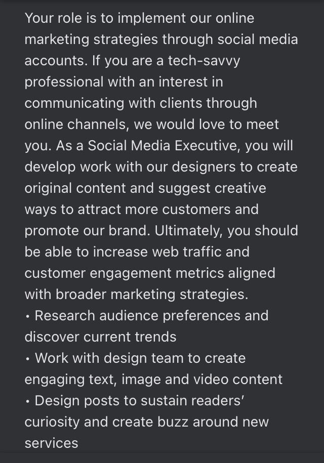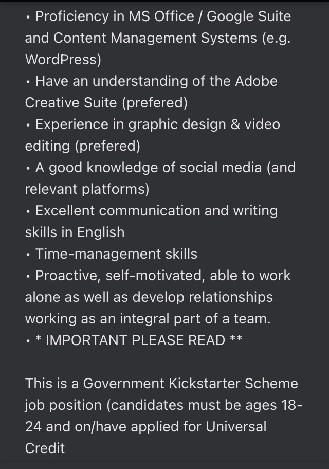 Even at the other end of the spectrum, its getting unrealistic. Below is an advert for a social media executive as part of the government Kick Start Scheme. This advert is aimed at 18-24s on Universal credit, yet the advert is recruiting a ‘tech-savvy professional with an interest in communicating through online channels’. When I was an 18 year old on job seekers allowance, I was none of those things.